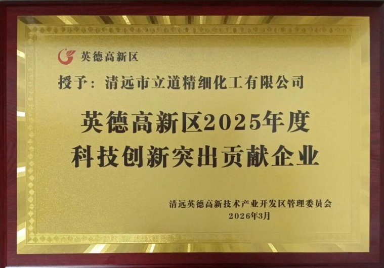 近日,清远英德高新技术产业开发区管理委员会正式授予立道集团--清远市立道精细化工有限公司 “英德高新区2025年度科技创新突出贡献企业” 荣誉称号。